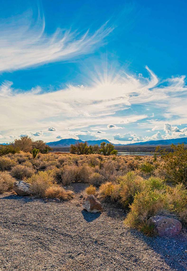 Desert landscape under a vibrant blue sky with whispy clouds. Sunlight brightly illuminates scrub bushes and rocks, with distant mountains on the horizon.
